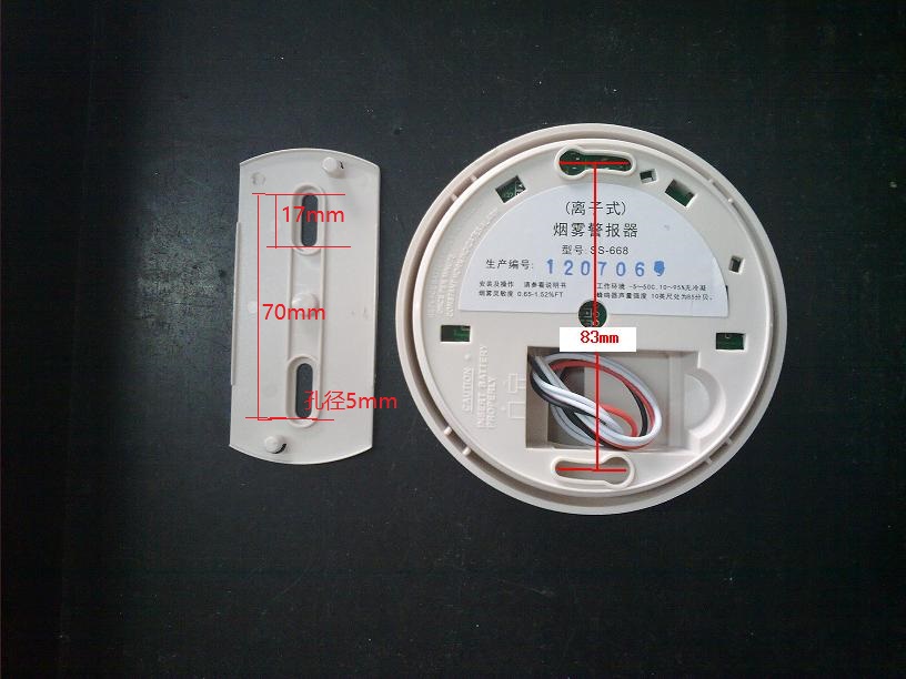 在天花板上相距 43~62.5mm 的位置上打兩個φ5mm 的安裝孔,用漲塞和螺釘固定報警器底座,連接電源線和輸出線。將報警器按正確方向扣在底座上,壓下后順時針方向旋緊。接通電源即可工作。接線如表 1 所示。
