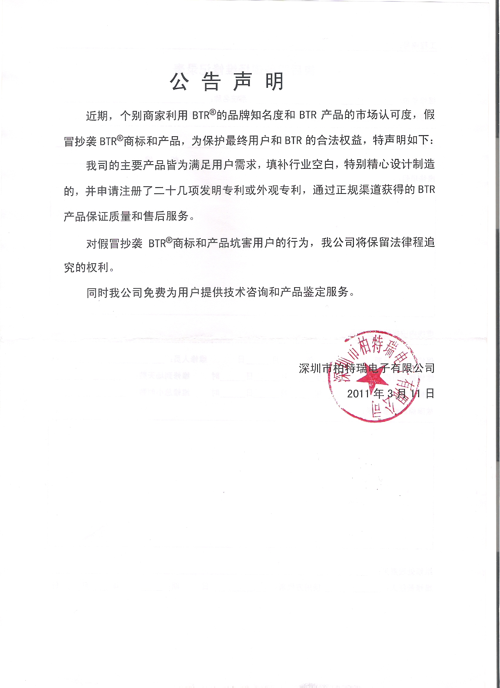To protect the end users and BTR’s legitimate rights and interests,we make statement as following: